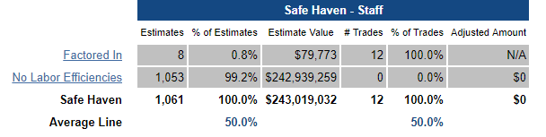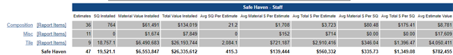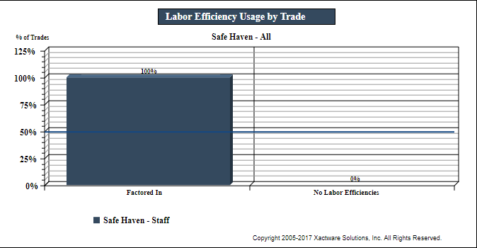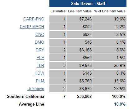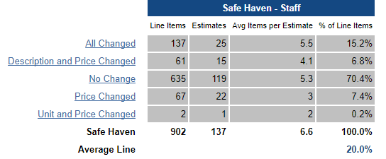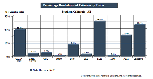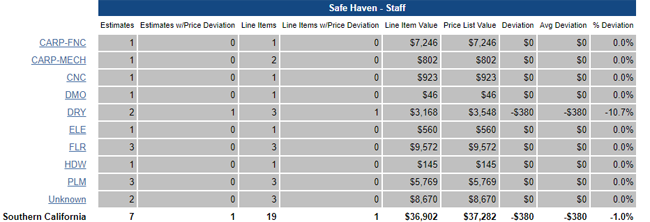 This report displays the percentage and value the line items from each trade (Carpenter, Plumber, etc.) contribute to the total estimate dollar value, helping you track the trades used most frequently.