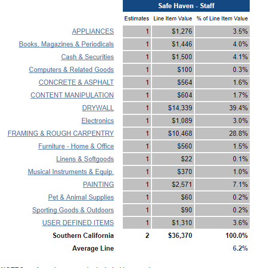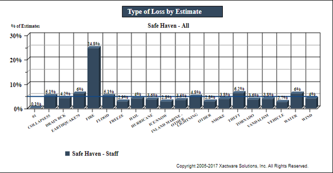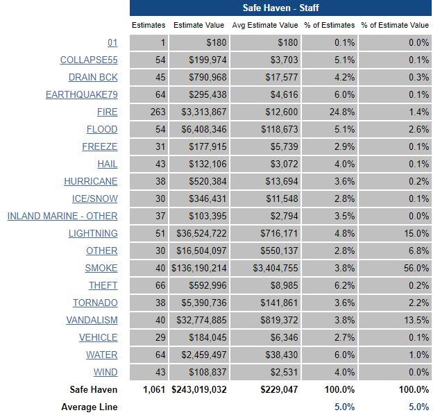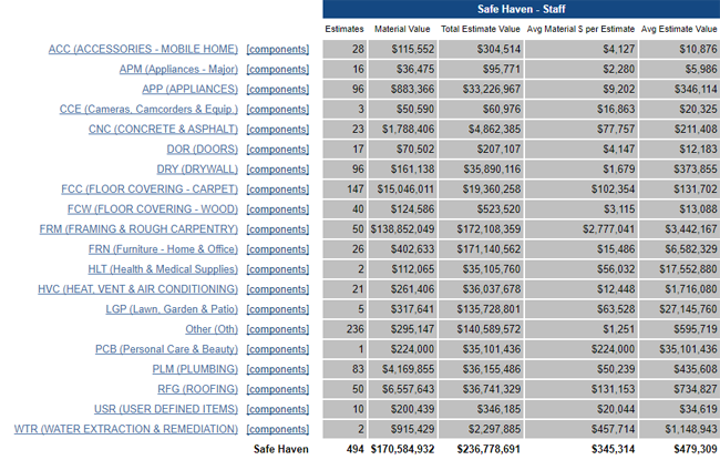 Cause of loss categories: Collapse, Fire, Frozen Pipe, Hail, Water Heater, etc (Select the Components link to see individual items used to categorize the estimates)