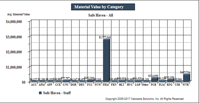 This report displays the 20 price list categories that contain the highest value of materials for a given data set or hierarchy. The Other total includes all categories that are not part of the 19 categories appearing in the report. Lower hierarchy levels may have material values that vary from these categories, so fewer categories may be displayed. This report helps you see which materials are most and least used.