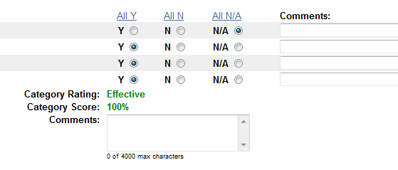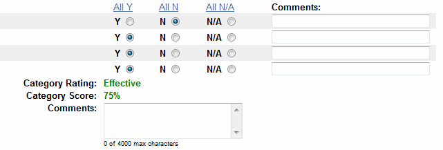 Your company determines what percentage of questions answered Yes merits an Effective rating. For example, if your company determines that a score of 70% or above is Effective, a score of 69% or lower is automatically rated as Ineffective. The Category Rating scores all questions equally unless your company has opted to weigh some questions more than others.