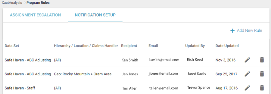 The Program Rules module allows you to set up notifications to inform you of issues with service providers and internal programs. In the Assignment Escalation tab, you set up notifications for assignment escalation issues, and in Notification Setup, you determine exactly who should be notified regarding these issues. You can set up multiple employees to be notified for any location, and you can set up any employee to receive notifications for multiple locations.