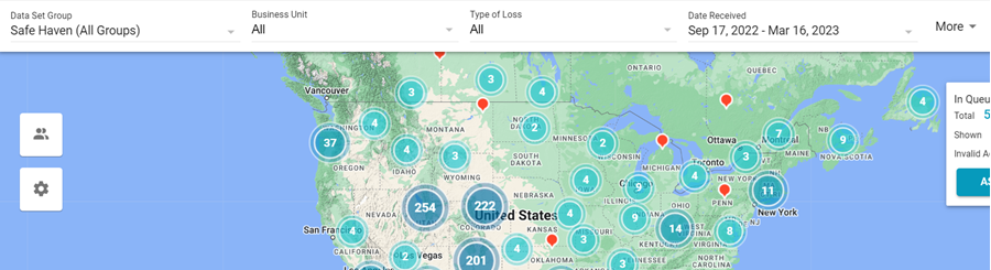 The Assignment Queue map uses Google Maps to display the location of every assignment that is currently in progress (colored shapes) or unassigned (red location markers).