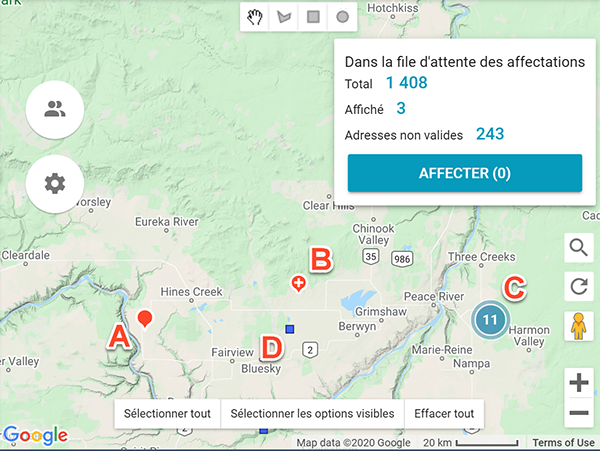 Le plan affiche les affectations figurant dans votre file d'attente pendant 180 jours suivant la réception. Les affectations dont l'adresse est incomplète ne s'affichent pas.