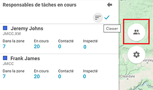 Afin de visualiser les renseignements de tous les titulaires d’affectation à l’intérieur de la zone visible de la carte, cliquez sur le bouton Titulaires d’affectation en cours à gauche de la carte. Le tiroir Titulaires d’affectation en cours s’ouvrira alors.