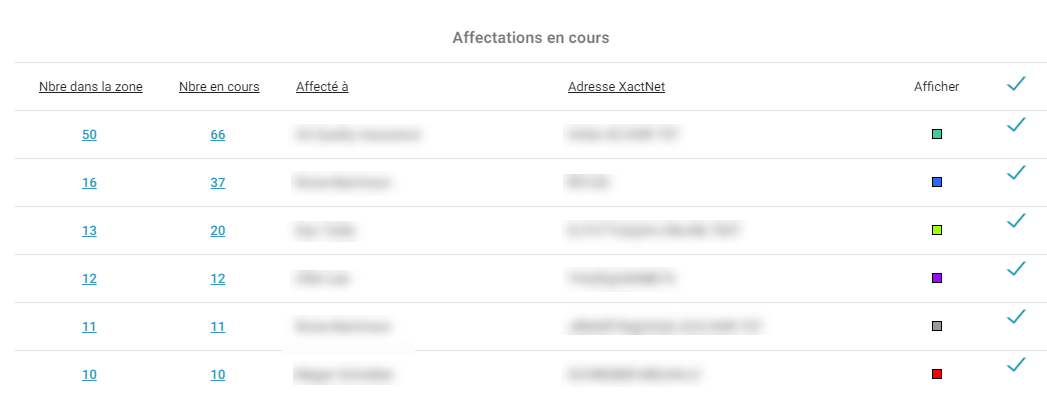 Cliquez sur le crochet d’une affectation pour faire disparaître celle-ci de la carte. Cliquez également sur le crochet dans le haut du tiroir pour faire disparaître toutes les affectations en cours de la carte.
