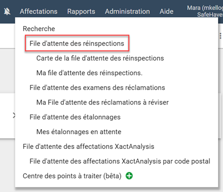 - Sélectionner File d’attente de réinspections dans le menu Affectations. Pour voir uniquement les réinspections qui vous sont affectées, sélectionnez Ma file d’attente des réinspections.