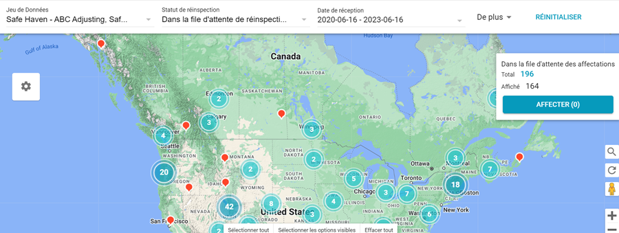 La carte de la file d’attente de réinspections affiche l’emplacement géographique des réinspections dans la file d’attente de réinspections et permet aux administrateurs de sélectionner les réinspections et de les affecter à un deuxième inspecteur.