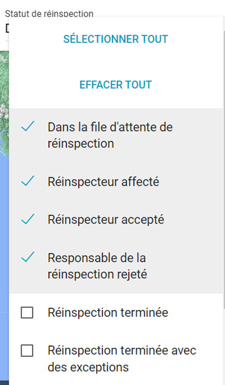 Vous pouvez filtrer la carte par Statut de réinspection directement à partir de la bannière de filtre.