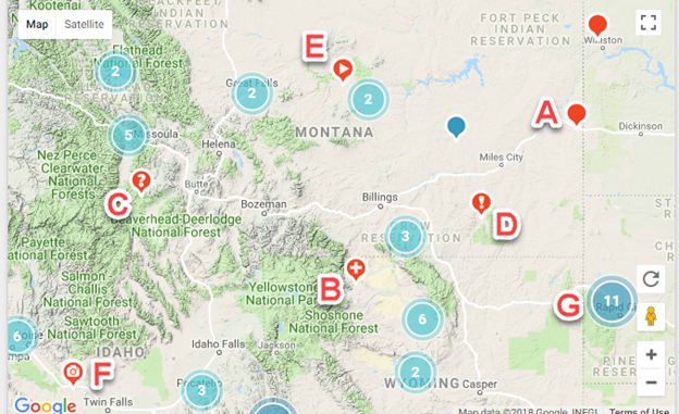 G – Les cercles bleus représentent des groupes d’affectations dans une région. Le nombre d’affectations est affiché dans le cercle. Cliquez sur le cercle pour faire un zoom avant et voir les affectations individuelles et les regroupements supplémentaires.