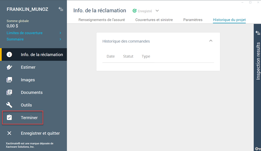 - Après avoir entré tous les renseignements requis, cliquez sur Finalisation. Xactimate regroupe les renseignements dans l’affectation de réinspection pour les téléverser dans XactAnalysis QR.