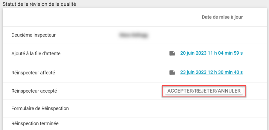 - Dans la section Statut de la vérification de la qualité de l’onglet Details, allez à la ligne deuxième Réinspecteur accepté et sélectionnez Accepter/Rejeter/Annuler.