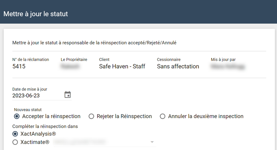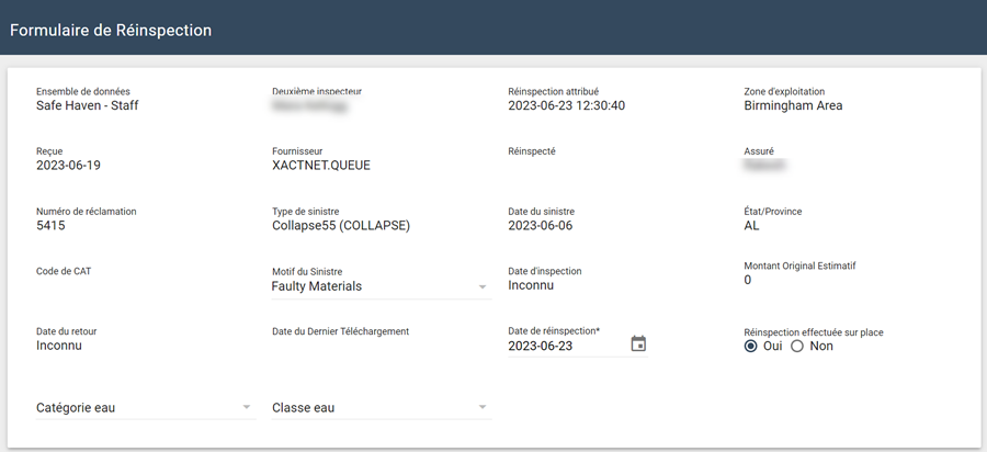 Une fois que vous avez accepté la réinspection, l’horodatage de l’état du deuxième inspecteur accepté s’affiche dans la section statut de réinspection de l’onglet Détails. L’affectation a été envoyée à votre adresse Xactimate.