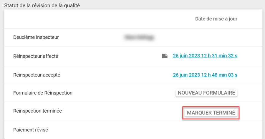 Une fois que vous avez accepté la réinspection, l’état de deuxième inspecteur accepté est mis à jour et un lien vers un nouveau formulaire de réinspection s’affiche dans la section statut de réinspection de l’onglet Détails.