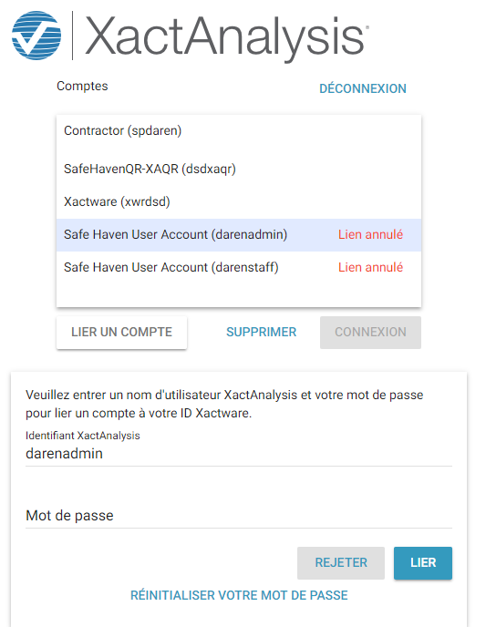 - Dans les champs qui apparaissent ci-dessous, entrez votre ID d’utilisateur XactAnalysis et mot de passe, puis cliquez sur Lien. Dans la section Comptes XactAnalysis, vous pouvez voir que le compte ne porte plus la mention « non relié ».