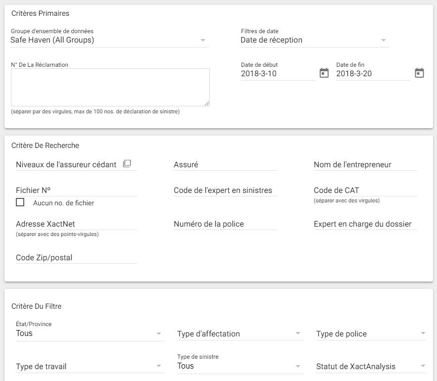 Utilisez le menu du filtre de date principal pour rechercher des affectations qui ont été reçues, livrées, retournées, corrigées, annulées, rejetées, entrées dans la file d’attente, avec date de sinistre, avec analyse tiers demandée, ou avec analyse tiers reçue au cours d’une certaine période.