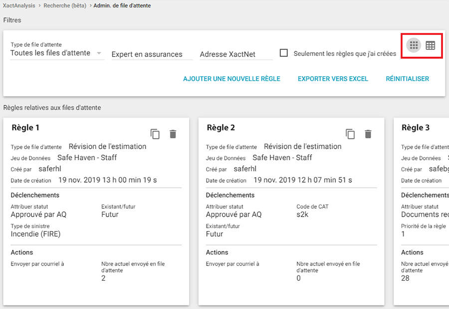 Une fois créées, les règles apparaissent sous forme de cartes sous les filtres. Chaque carte affiche des données de base sur la règle, ce qui déclenche la règle et les actions qui se produisent lorsque la règle est déclenchée. Au bas de chaque carte se trouve un numéro lié sous le Nbre actuel envoyé en file d'attente. En cliquant sur ce nombre, un nouvel onglet du navigateur s’ouvre et affiche les réclamations prises en compte par la règle dans la Recherche.
