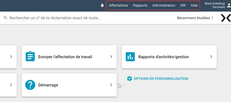 Dans XactAnalysis, les menus Affectations, Rapports, Administration, et Aide s'affichent en haut de chaque page. Ces menus vous permettent d'accéder à pratiquement chaque section de XactAnalysis. Les trois principaux menus, Affectations, Rapports, et Administration, concordent avec les sections de formation qui se trouvent dans le volet gauche de ce guide.