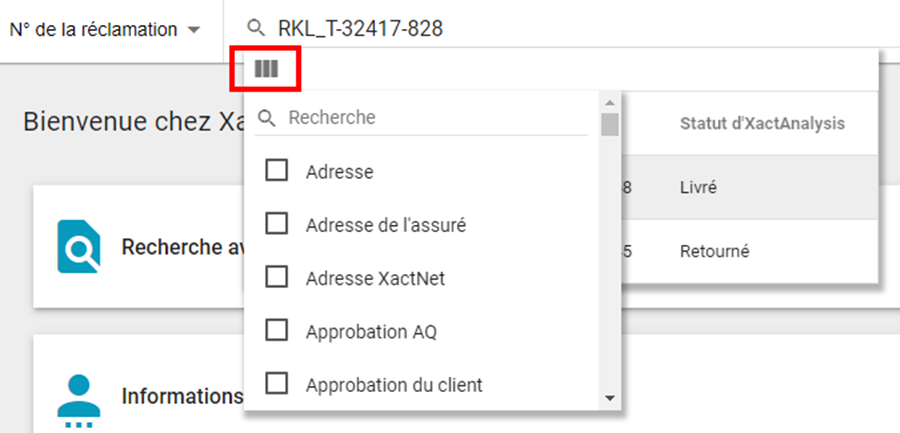 - Vous pouvez également personnaliser les colonnes par défaut qui apparaissent dans la boîte de résultats. Pour configurer ces colonnes, veuillez communiquer avec votre gestionnaire de compte.