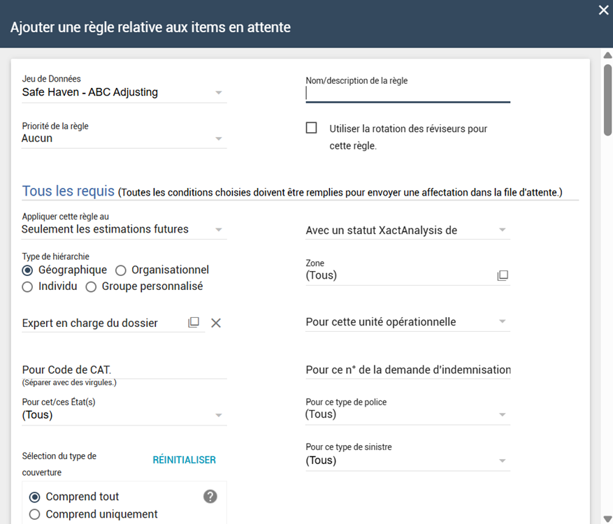 Sélectionnez un ou plusieurs types de perte dans le menu. Sélectionnez (Tous) pour autoriser les estimations avec n’importe quel type de perte dans la file d’attente d'examen.