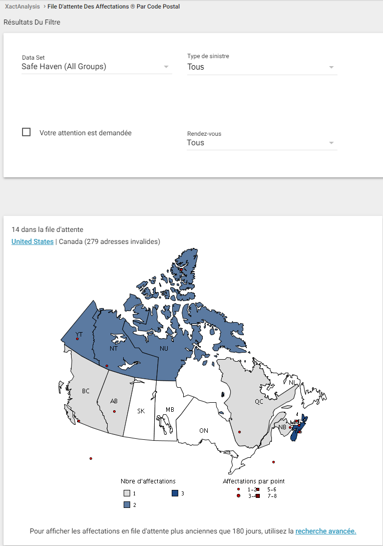 - Dans File d'attente des affectations par code postal, un plan s'affiche avec délimitations des régions pour indiquer l'emplacement de chaque affectation. La zone de filtrage des résultats vous permet de filtrer les affectations par ensemble de données, type de sinistre, type de police, type de travail, catastrophique/non catastrophique, attention nécessaire et rendez-vous. La zone Paramètres de carte vous permet de passer à un code postal spécifique et de sélectionner une taille de carte. Appliquez les paramètres de votre choix.