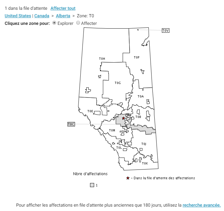 - Cliquez sur une zone de code postal. Les affectations s'affichent dans la page des résultats de la recherche dans File d'attente des affectations.