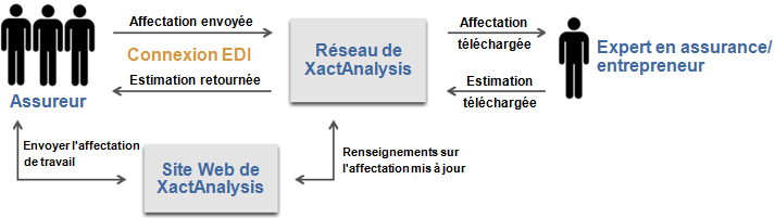 Connexion par le biais de l’Échange de documents informatisés (EDI) : Les compagnies d’assurance utilisent leurs propres systèmes pour entrer les renseignements d’affectation et les envoyer vers XactAnalysis à l’aide de la connexion EDI.