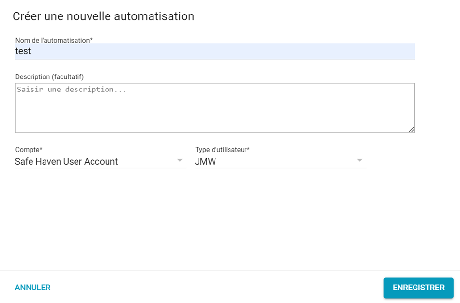 3. Cliquez sur le bouton Créer une automatisation. La fenêtre Créer une nouvelle automatisation s'ouvre.