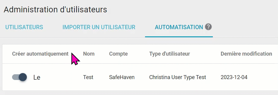 L'onglet Automatisation permet de générer automatiquement de nouveaux utilisateurs, ainsi que leurs droits sur l'ensemble des données, l'organisation et l'application.