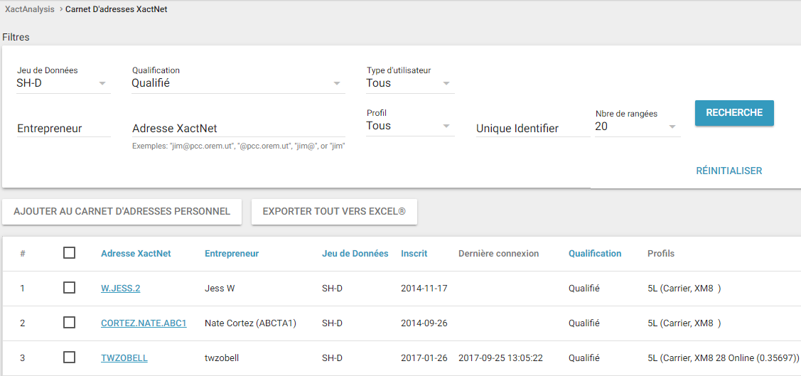 Dans le carnet d'adresses XactNet, vous pouvez afficher et classer la liste des cessionnaires (les destinataires d’une affectation) disponibles à votre entreprise. Le carnet d'adresses de XactNet comprend également d’autres renseignements utiles sur chaque cessionnaire, tels que la version Xactimate® utilisée, la date et l’heure de la dernière connexion, et le statut de qualification.